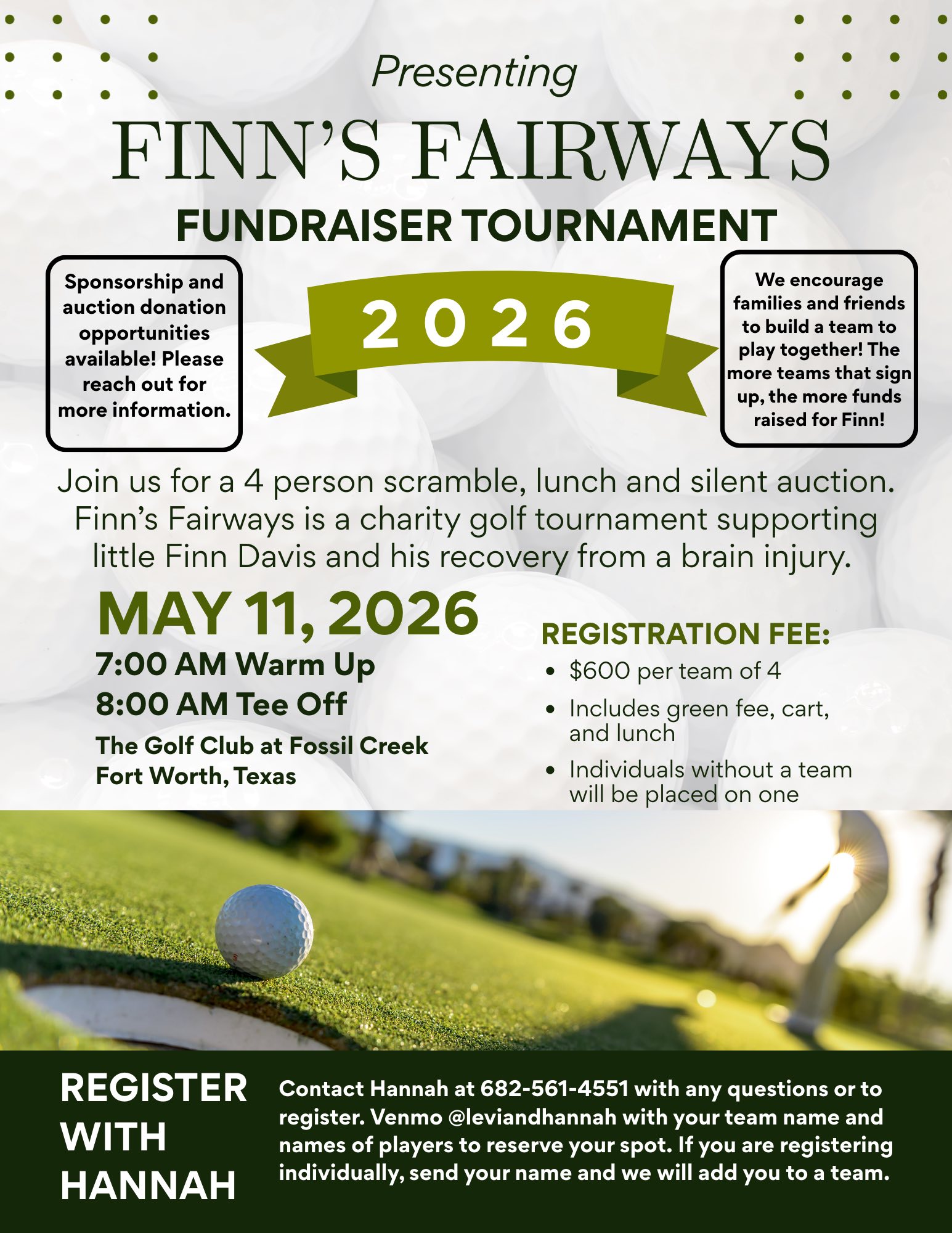Join us for a 4 person scramble, lunch and silent auction supporting little Finn Davis and his recovery from a brain injury.